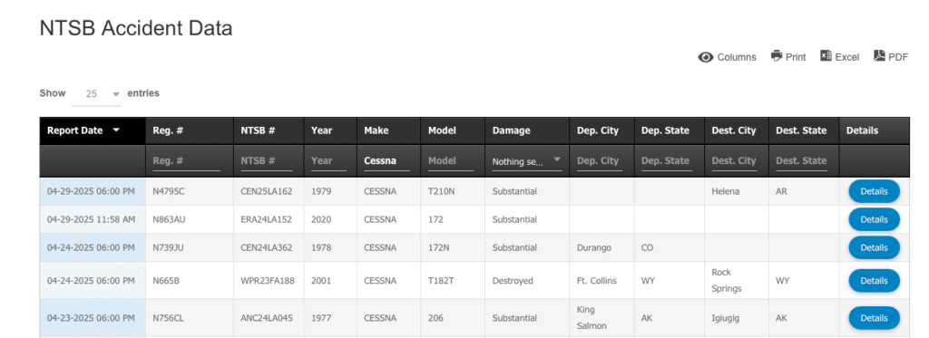 All accident and incident records come directly from the NTSB (National Transportation Safety Board) database, including full event narratives, damage classification, and injury severity. Registration data comes from the FAA Civil Aviation Registry. Both are updated regularly so you're always seeing the latest information.
